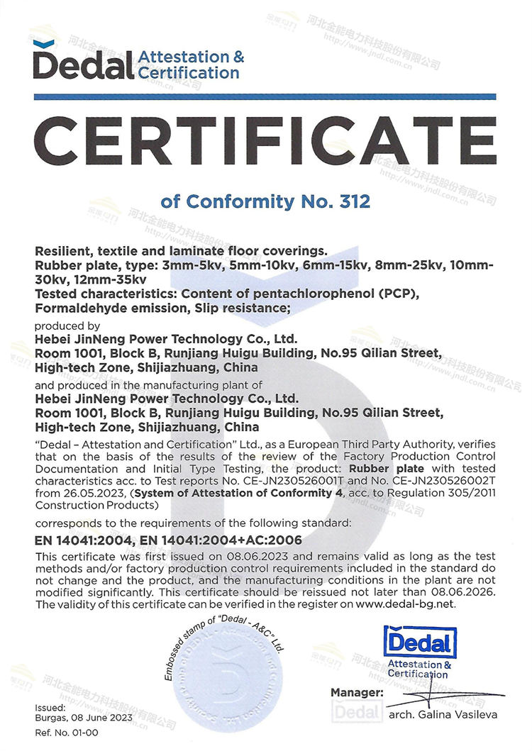 絕緣膠墊是電力安全不可或缺的一部分,其質(zhì)量和性能對于保護(hù)人員的安全至關(guān)重要。通過獲得CE認(rèn)證,并結(jié)合已于先前通過的國際電工協(xié)會IEC耐壓性能檢測報告,說明金能電力絕緣膠墊的產(chǎn)品質(zhì)量、安全性和環(huán)保等級的肯定已經(jīng)得到主管機(jī)構(gòu)的認(rèn)可,產(chǎn)品符合歐盟的相關(guān)標(biāo)準(zhǔn)和法規(guī)要求。
