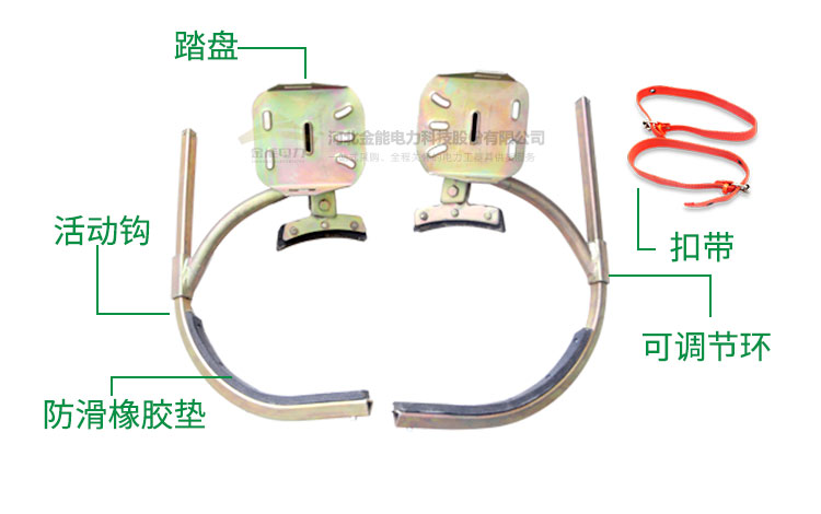 金能腳扣配有可調(diào)節(jié)套環(huán),腳扣可以靈活調(diào)節(jié)。腳扣借助人身重量,緊扣電線(xiàn)桿,產(chǎn)生較大的摩擦力,易于攀登,操作輕巧。