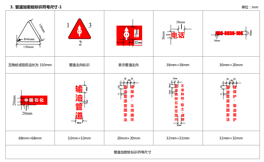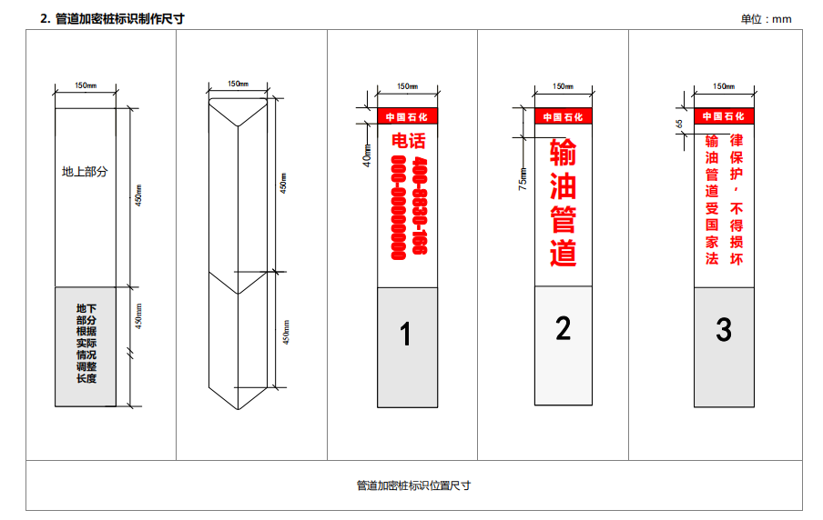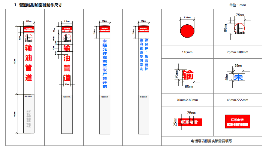 臨時加密樁材料: ø110mm×3mm×1100mm PVC 管制作,標識的內(nèi)容用戶外漆絲印。